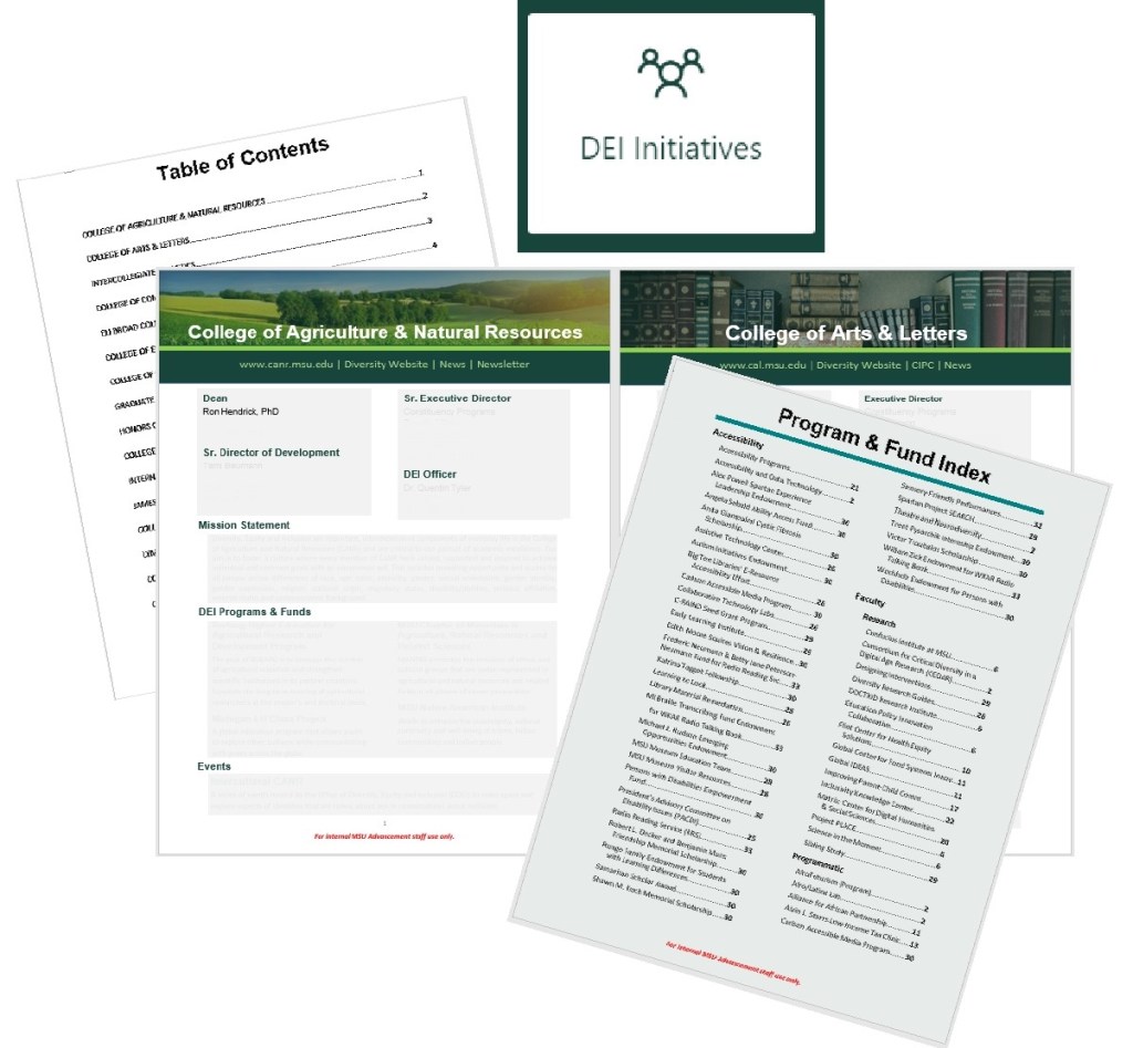 In an effort to coordinate the diversity fundraising efforts for MSU University Advancement, I developed a diversity, equity, and inclusion reference document for the UA team. The document was organized alphabetically, with a page for each MSU college and unit, detailing their diversity programs, funds, and administrators. While the research and proofreading was done in collaboration with colleagues, I completed the document design, layout, and editing independently.